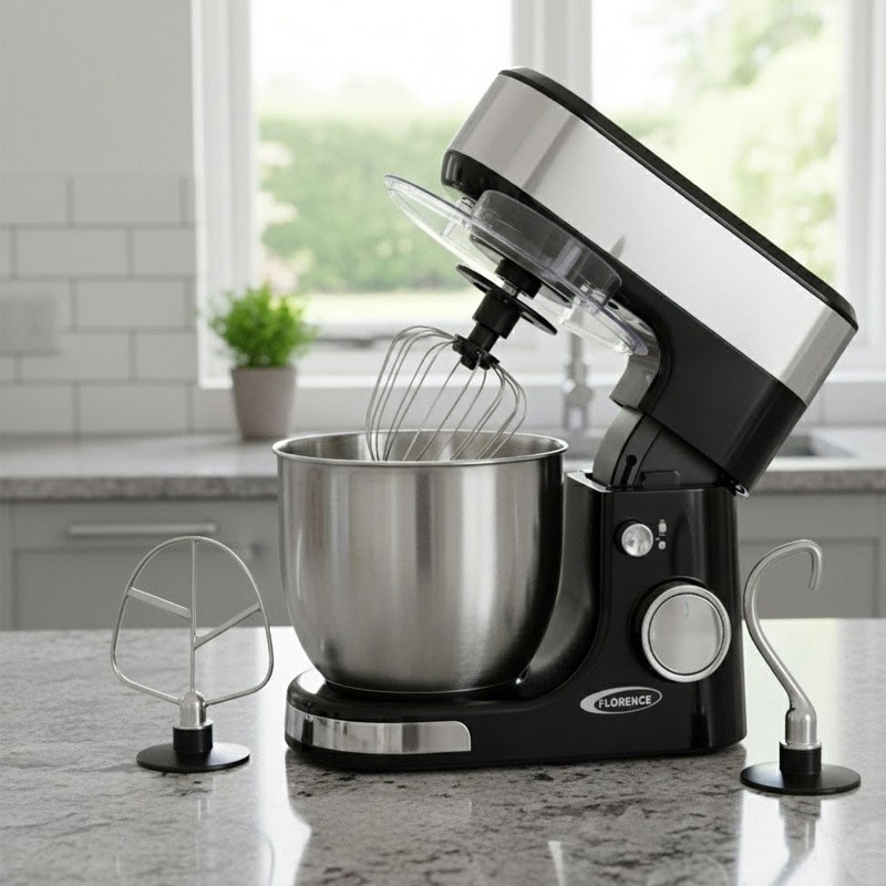 Robot Pétrin FLORENCE - Puissance : 1300W - Capacité du bol : 5 Litres - Nombre de vitesses : 8 Vitesses + fonction Pulse - Fonctions : Réglage du temps & vitesse - Affichage : Écran digital LED - Sécurité : Système de verrouillage - Couvercle : Transparent antiprojection - Accessoires inclus : Crochet pétrisseur, fouet, batteur - Couleur : Noir - Garantie : 1 an