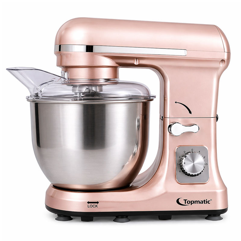 Robot pétrin TOPMATIC - Capacité du bol : 5 Litres - Puissance : 1400 W - Nombre de vitesses : 6 vitesses - Contrôle de vitesse fluide - Bol en Acier Inoxydable - Crochet à pâte épaisse, Batteur à mélanger - Bouclier antiéclaboussures transparent amovible - Pieds antidérapants - Dimensions : 350 x 180 x 303 mm - Couleur : Rose Gold - Garantie : 1 an