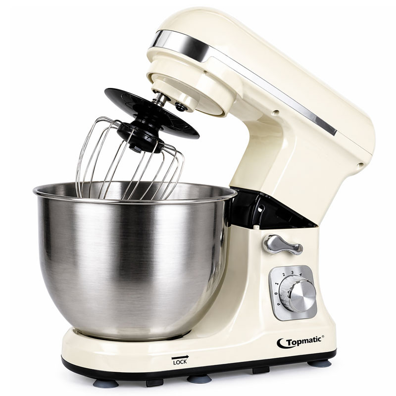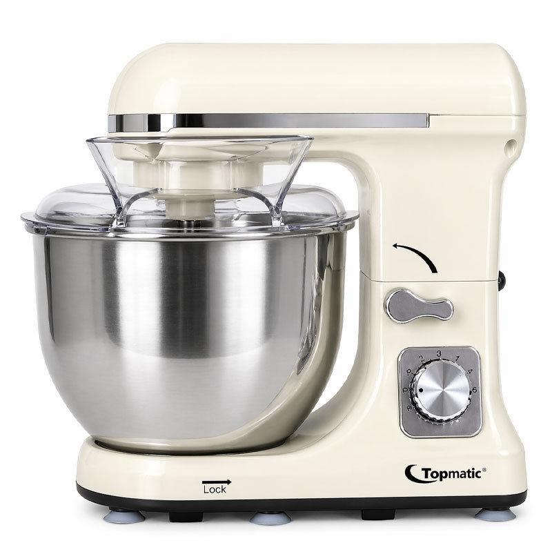 Robot pétrin TOPMATIC - Capacité du bol : 5 Litres - Puissance : 1400 W - Nombre de vitesses : 6 vitesses - Contrôle de vitesse fluide - Bol en Acier Inoxydable - Crochet à pâte épaisse, Batteur à mélanger - Bouclier antiéclaboussures transparent amovible - Pieds antidérapants - Dimensions : 350 x 180 x 303 mm - Couleur : Beige - Garantie : 1 an