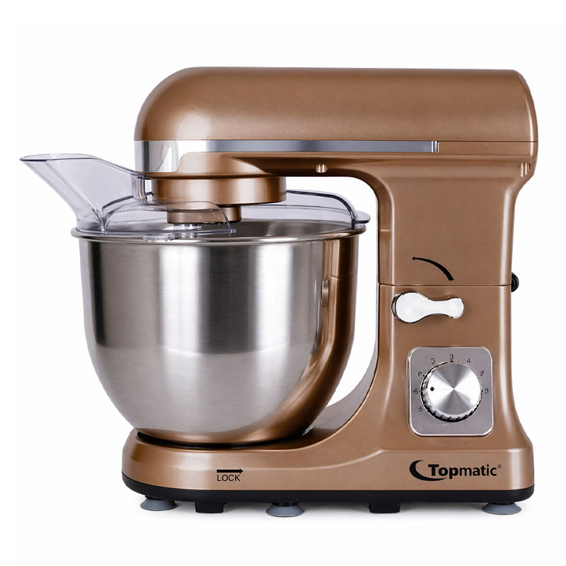 Robot pétrin TOPMATIC - Capacité du bol : 5 Litres - Puissance : 1400 W - Nombre de vitesses : 6 vitesses - Contrôle de vitesse fluide - Bol en Acier Inoxydable - Crochet à pâte épaisse, Batteur à mélanger - Bouclier antiéclaboussures transparent amovible - Pieds antidérapants - Poids : 3.8 kg- Dimensions : 350 x 180 x 303 mm - Couleur : Cuivre - Garantie : 1 an