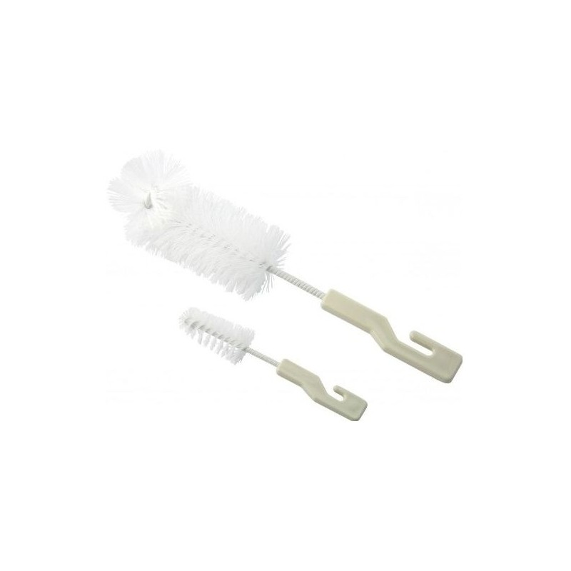 Set 2 brosses de nettoyage des biberons et tetines - Sa forme spéciale et ses poils en nylon résistants permettent de nettoyer efficacement tous les endroits meme les plus difficiles d'acces - Emballage: Blister - Couleur Blanc