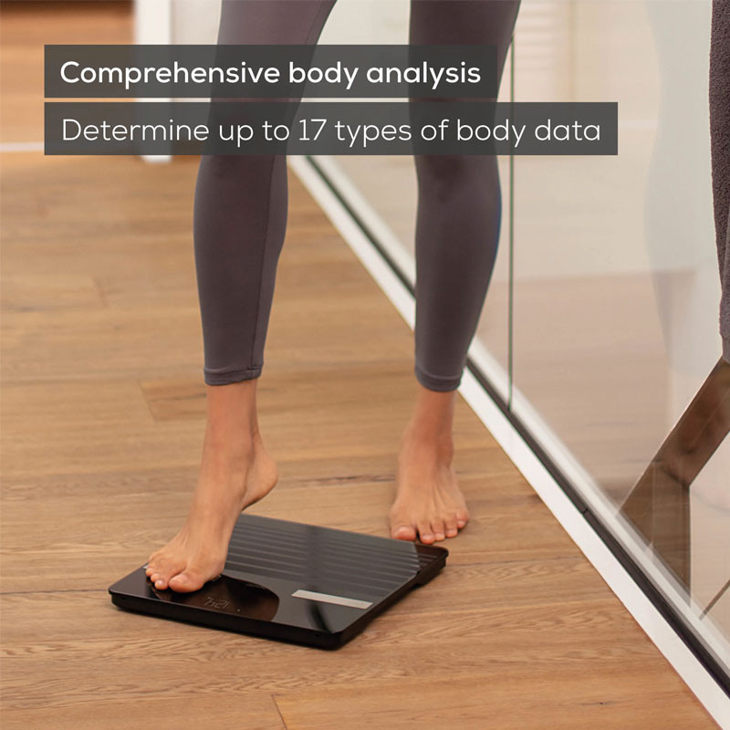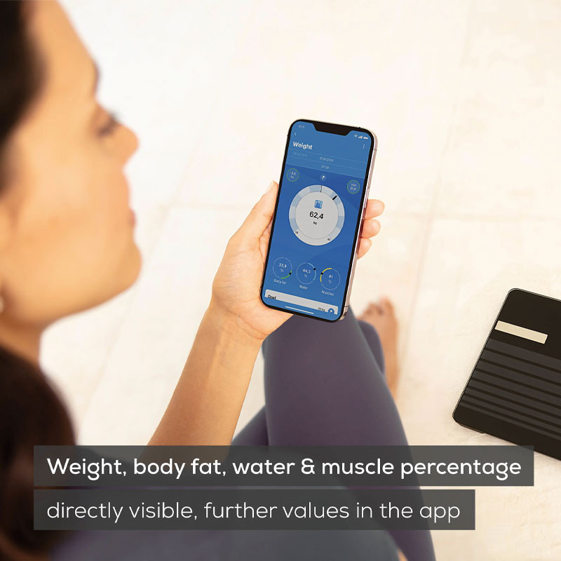 Capacité de poids maximale : 180 kg - Graduation : 100 g - Taille de la surface debout : 30 cm x 30 cm - Épaisseur du verre de sécurité : 6 mm - Nombre de niveaux d'activité : 5 niveaux - Nombre d'utilisateurs : 8 utilisateurs - Matériau de surface debout : Verre de sécurité - Reconnaissance automatique des utilisateurs - Indicateur de surcharge - Connectivité : Bluetooth - Poids : 1,57 kg - Couleur : Noir - Garantie 1 an