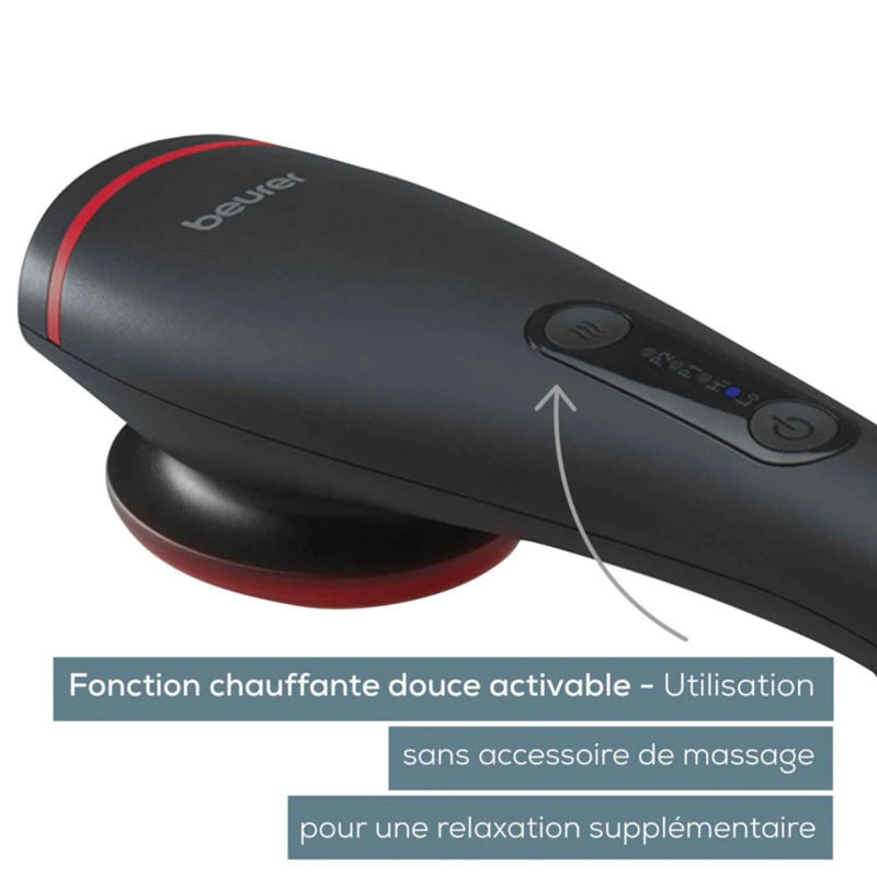 Appareil De Massage Manuel BEURER - 3x embouts de massage de haute qualité pour une utilisation personnalisée - Fonction chauffante - Nombre de Programmes : 2 programmes de massage au choix - Niveaux d'intensité : 2 Niveaux - Poignée antidérapante pour une manipulation confortable - Massage par vibrations - Poids : 430 g - Couleur : Noir - Garantie 1an