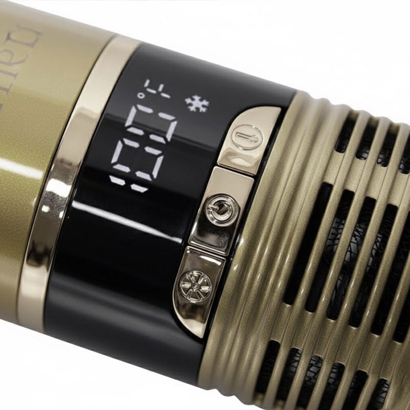 Brosse Soufflante FLORENCE - Puissance : 1000W - Technologie : Air chaud + revêtement antistatique - Température réglable : Multi-niveaux selon le type de cheveux - AVEC Afficheur - Fonctions : Lissage et Séchage rapide - Câble Rotatif 360° - Sécurité : Protection contre la surchauffe - Couleur : Gold - Garantie : 1 an