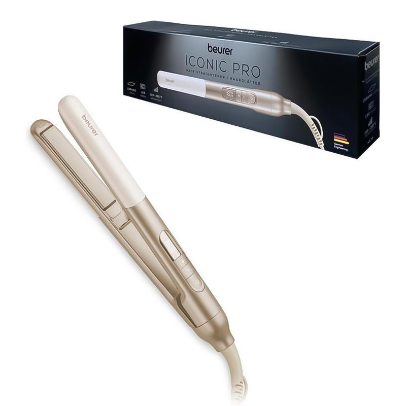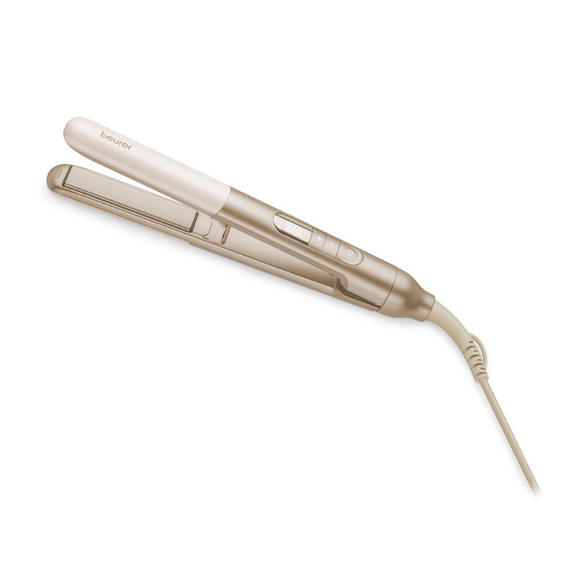 Lisseur céramique BEURER - Température réglable : de 120 à 230°C - Revêtement en Céramique - Fonction ionique - Arrêt automatique - Plaques arrondies pour des boucles et des ondulations - Longueur du cordon : 1.5m - Couleur : Gold - Garantie 1an