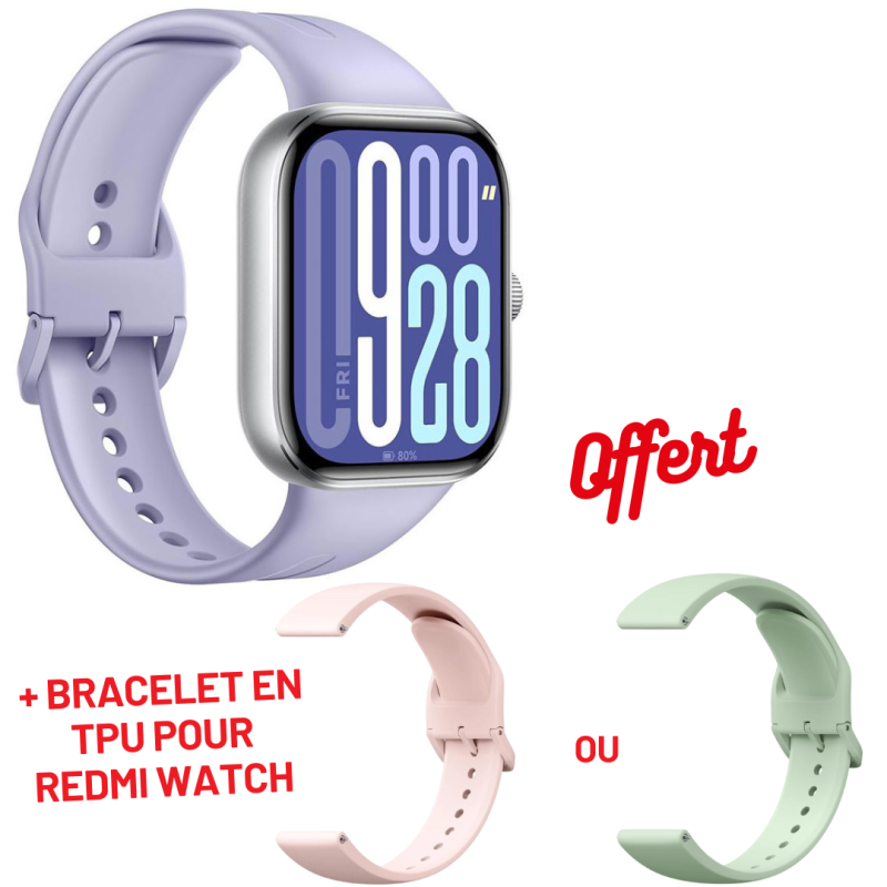 Montre Connectée XIAOMI REDMI - Ecran AMOLED carré ultra-large 2,07" - Résolution : 432 × 514 pixels - Taux de rafraîchissement : 60 Hz - Système d'exploitation : Xiaomi HyperOS - Connectivité : Bluetooth 5.3 - Haut-parleur intégré - Microphone : 2 micros - Appel Bluetooth : Pris en charge - Bracelet en TPU : environ 135–205 mm - Stockage local disponible : 164 Mo - Résistance à l'eau : 5 ATM - Durée d'utilisation standard : 24 jours - Capacité de la Batterie : 550 mAh - Compatibilité : Compatible avec les smartphones équipés d'Android 8.0 et plus, ou d'iOS 12.0 et plus - Couleur : Violet - Garantie 1an