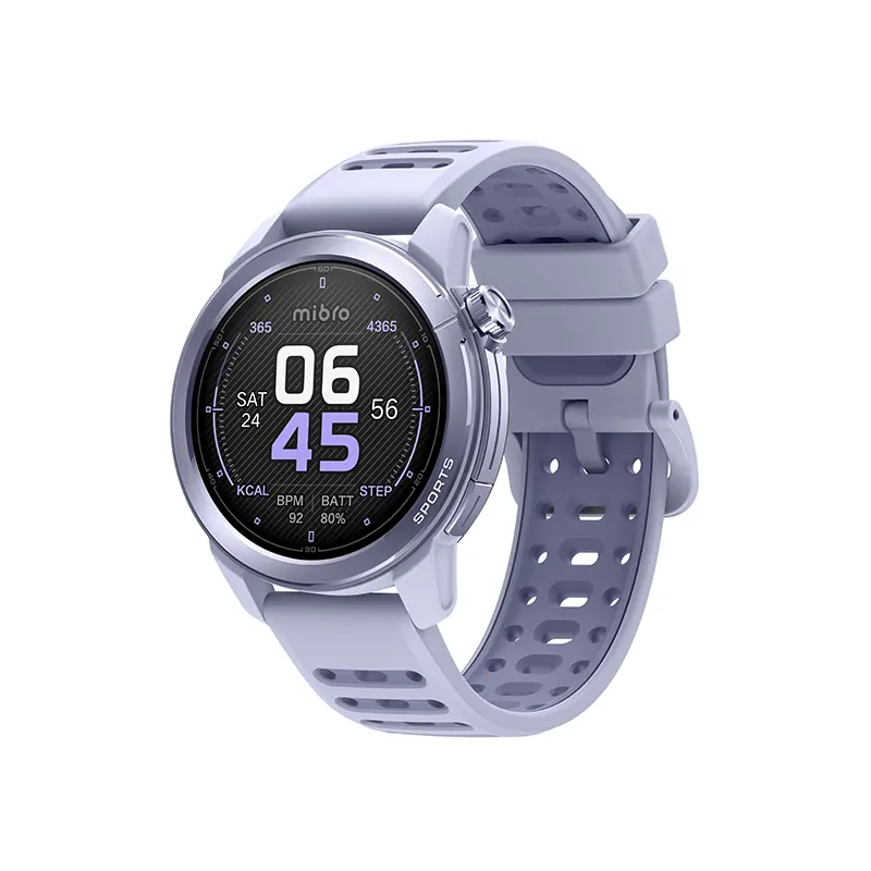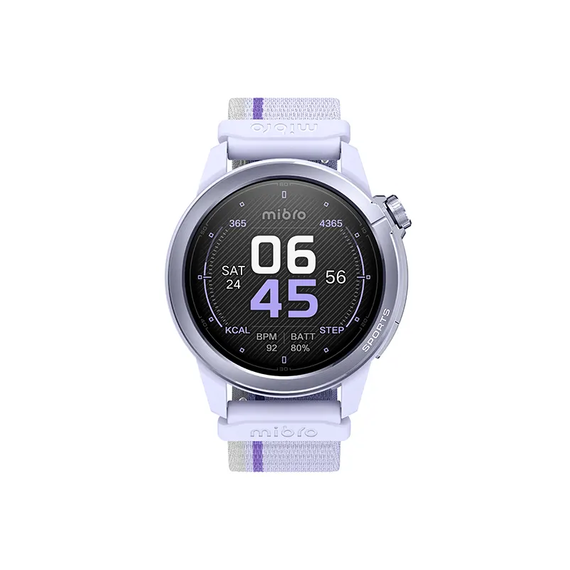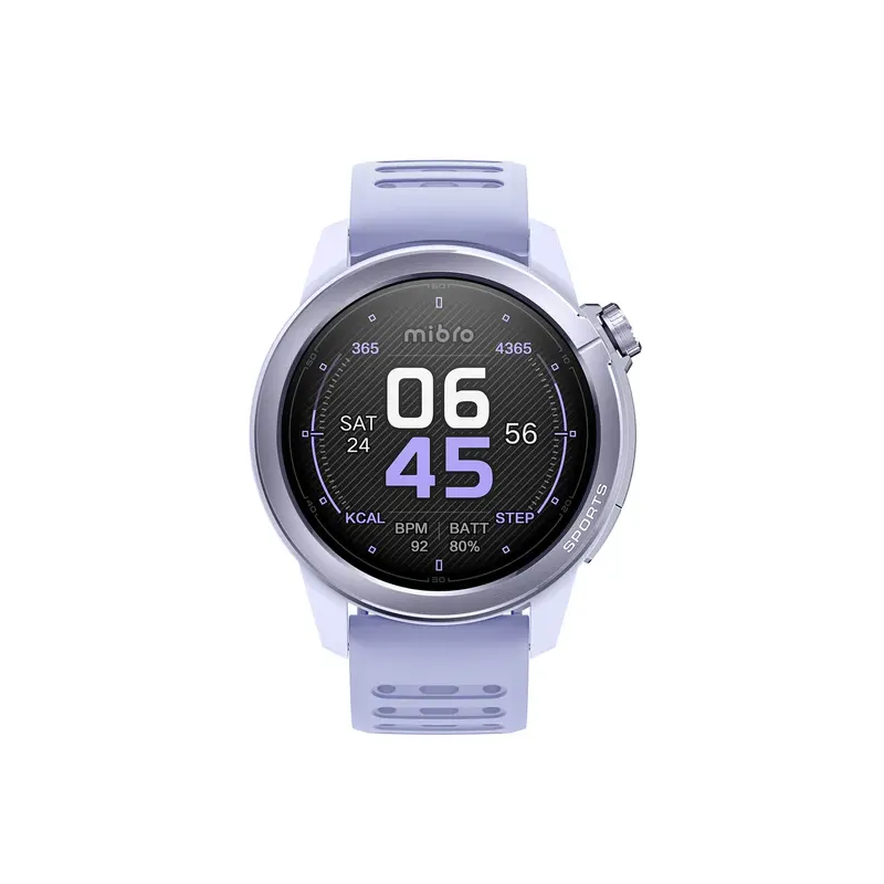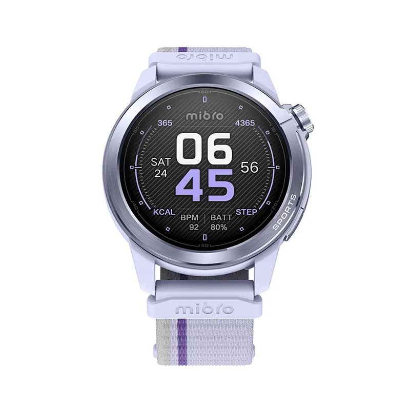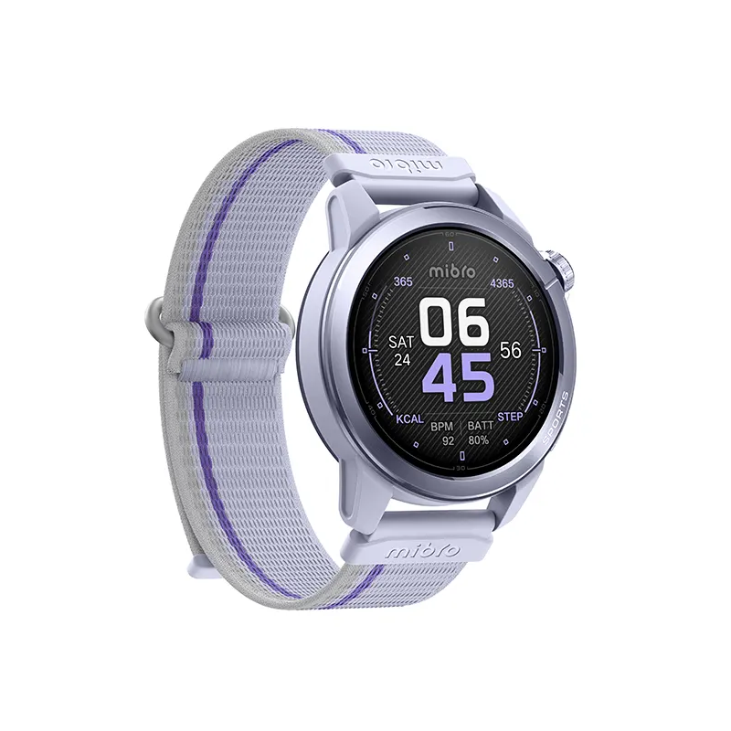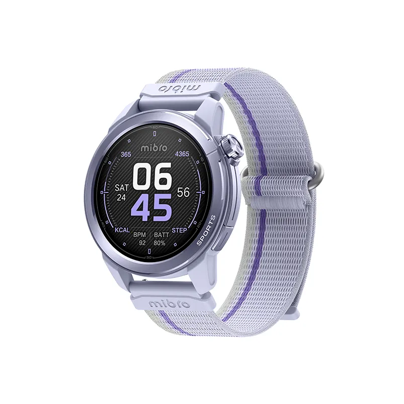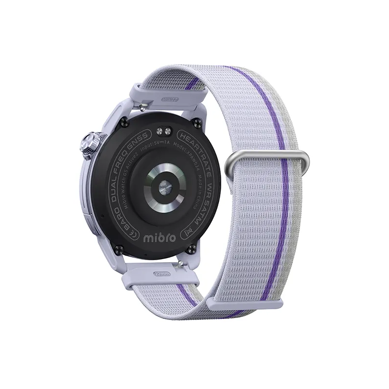 Smartwatch Mibro Watch GS Active 2 - Écran AMOLED 1.32" (466 x 466, AOD, 1 200 nits, PPI 353) - Matériel : Alliage d'aluminium + (PA+GF) + Silicone liquide bicolore/Tissé - Autonomie de la batterie : Mode veille : 45 jours / Mode quotidien : 15 jours / Mode GPS : 15 heures, appel BT : 7 heures, musique : 6 heures - Type de charge magnétique - Bluetooth 5.3 - Capteur : PPG Fréquence cardiaque, Oxygène dans le sang, Accéléromètre, Gyroscope, Magnétomètre, Altimètre, Baromètre, Capteur de lumière, Carte NFC - Positionnement par satellite GPS/ Beidou/ GLONASS/ Galileo/ QZSS - Étanche: 5 ATM - Taille de la bande : Tissu, boucle en plastique, largeur : 22 mm, longueur dépliée : 246 mm / Boucle en silicone liquide bicolore + PC, largeur : 22 mm, longueur dépliée : 265 mm - Poids : 39,9 g (bracelet tissé), 51,7 g (bracelet en silicone) - Couleur Violet - Garantie 1 an