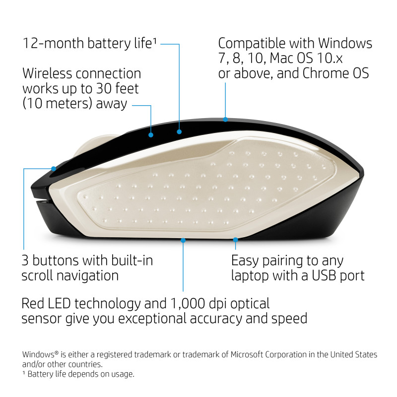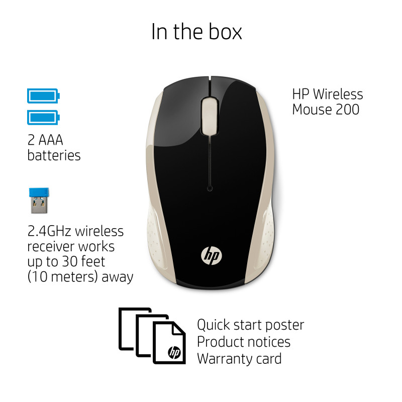 Souris sans fil HP 200 - Connectivité sans fil jusqu'à 30 pieds (10 m) - Fréquence sans fil 2.4 Ghz - Dimensions: 9.5 x 5.85 x 3.4 cm - Poids: 0.078 kg - Couleur: Noir & Gold