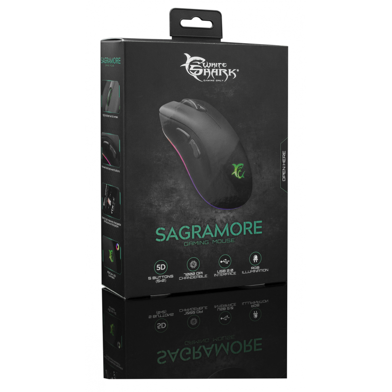 Souris Gamer WHITE SHARK Sagramore - 5x boutons + 2x boutons dpi,led - Capteur optique à 7000 dpi - – Interface avec l’ordinateur USB - Technologie de connectivité: Filaire - Revêtement en caoutchouc – Matériel: Plastique – Accélération: 20 G – Longueur du câble: 1.8m – Dimensions: 123 x 67 x 42 mm – Couleur Noir
