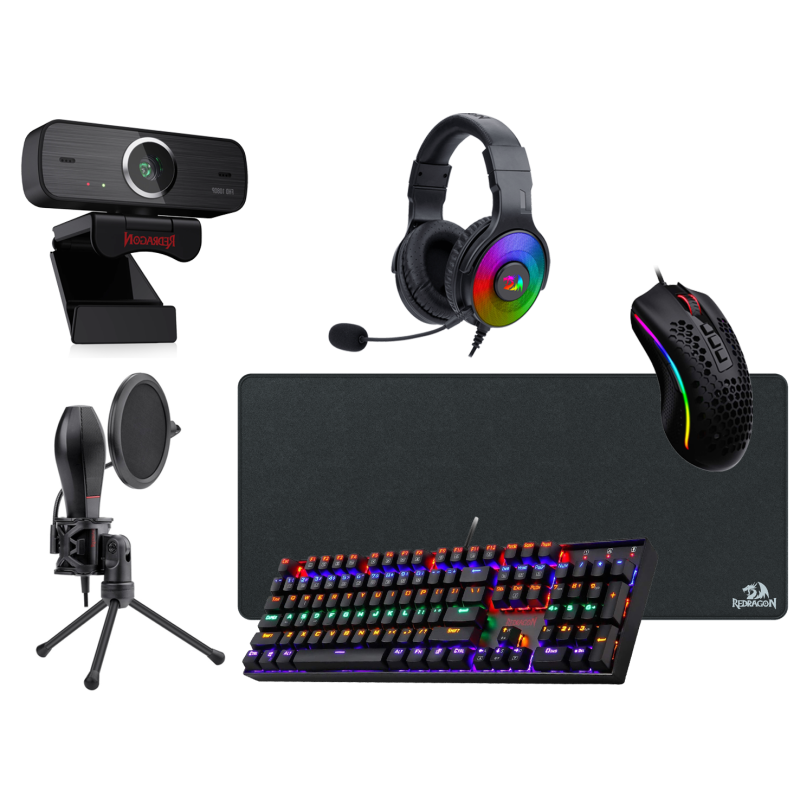 Pack streamer Redragon 6 en 1 - Microphone Gaming USB REDRAGON GM200 - Webcam Redragon Hitman GW800 FULL HD 30 FPS - Casque Micro Gaming Redragon Pandora H350 RGB - Souris Gamer Redragon M808 Storm Lightweight RGB - Tapis de souris Redragon Flick XL P032 (XLarge)
