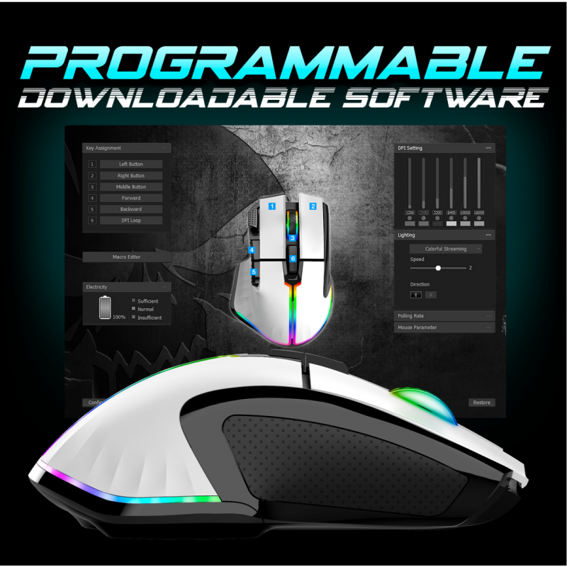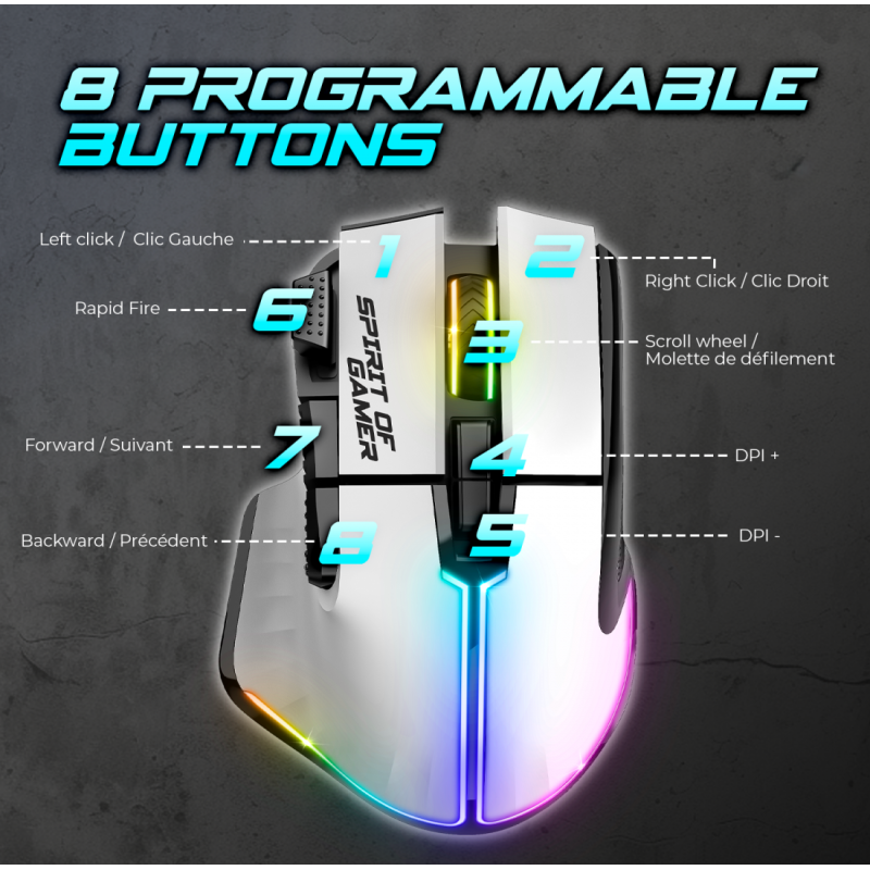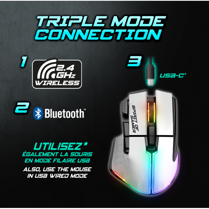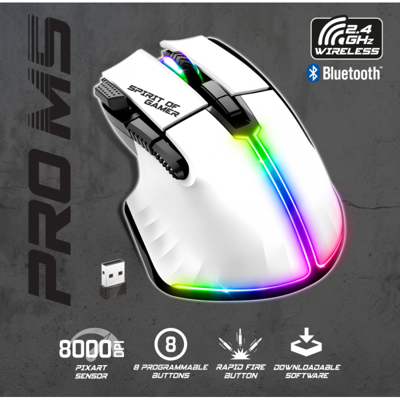 SOURIS Gamer sans fil SPIRIT OF GAMER PRO-M5 - Résolution : 8000 DPI - Taux de transfert : 500 Hz - Accélération : 10 G - 8 Boutons programmables - Batterie : 600 mAh - connexion (3 mode) : sans fil 2,4 GHz / Bluetooth / filaire USB - Distance de fonctionnement : 6 - 10 m - Vitesse : 30 ips - Rétro-éclairage : 7 effets RGB dynamiques - Compatibilité : Windows XP et versions ultérieures - Capteur : Optique - Dimensions : 12.5 x 8.4 x 4.6 cm - Poids : 146 g - Couleur : Blanc - Garantie 1 an
