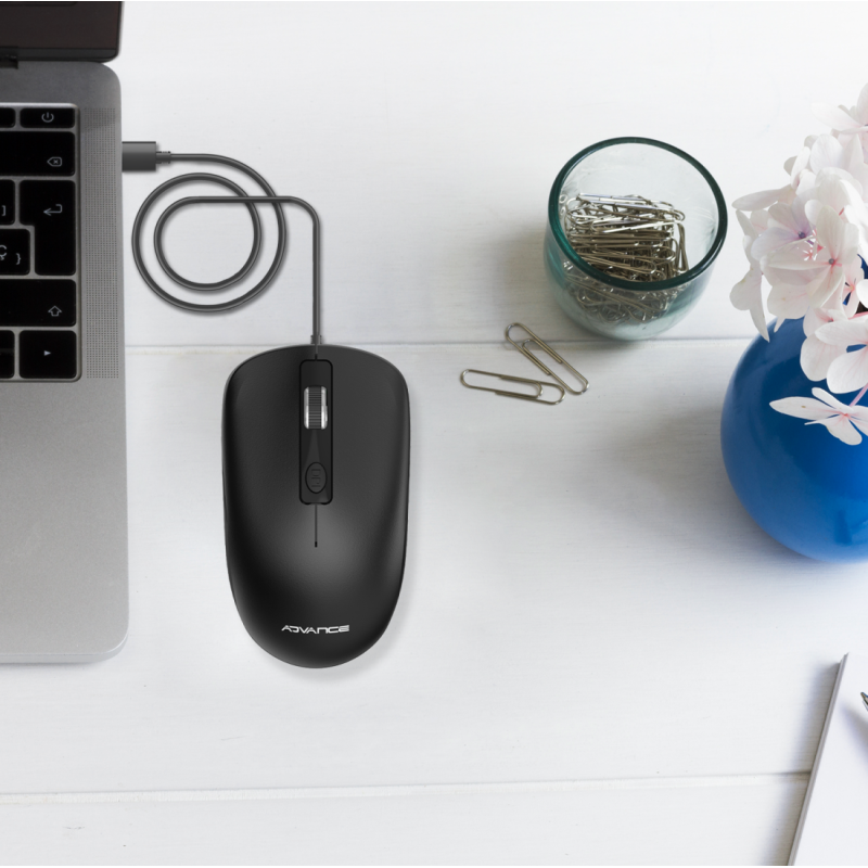 Souris filaire Advance SWIFT 4D - Résolution : 2400 DPI - Boutons : 4 boutons et molette de défilement - Connectivité : USB - Longueur du câble : 1,45 m - Dimensions : 10.3 x 6.1 x 4 cm - Poids : 70 g - Couleur Noir - Garantie 1 an