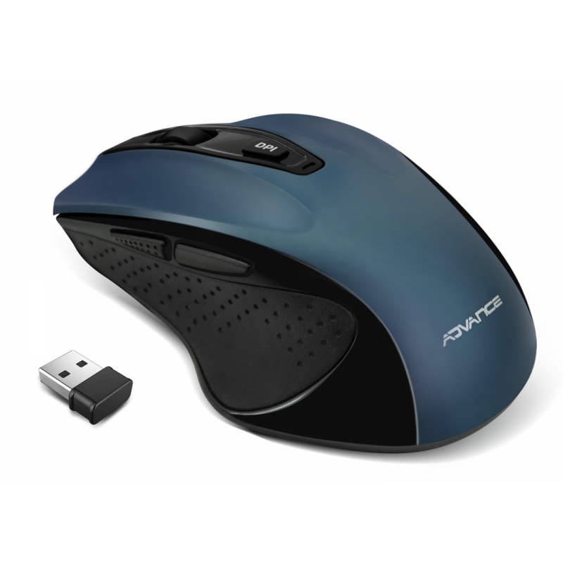 Souris ADVANCE S-SHAPE - Connexion : Sans fil 2,4 GHz - Résolution : 6 boutons et molette de défilement - Distance de fonctionnement : 8 - 10 m - Batterie : Piles AAA x 2 (non incluses) - Compatibilité : Windows XP et versions ultérieures, Mac OS X - Poids : 96 g - Couleur Bleu - Garantie 1 an