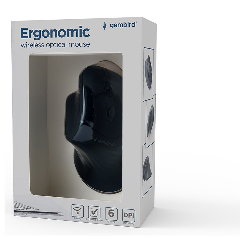 Souris optique sans fil GEMBIRD ergonomique - 6 boutons - Interface : Sans fil 2,4 GHz - Portée : jusqu’à 10 m - Résolution optique : 800/1 200/1 600 DPI - Alimentation : 2 piles AAA (non fournies) - Dimensions : 130 x 75 x 80 mm - poids : 103 g - Couleur Noir