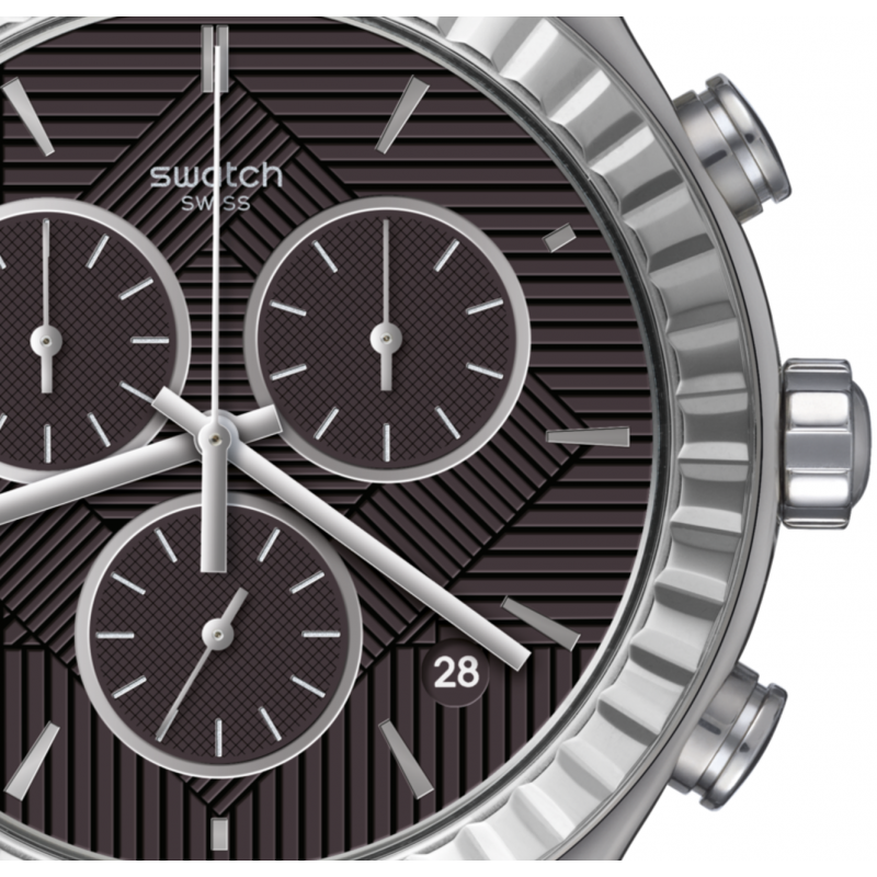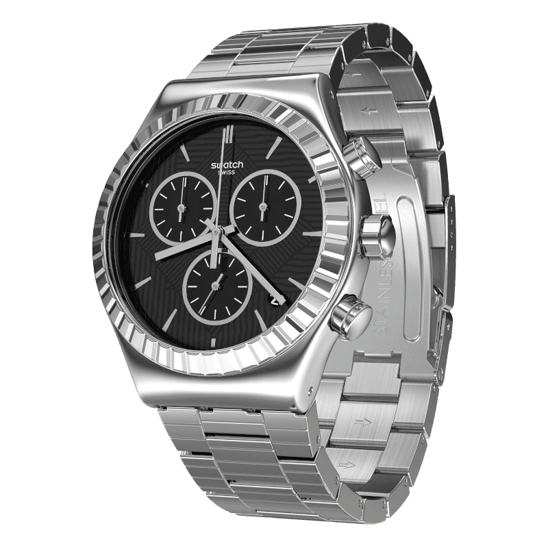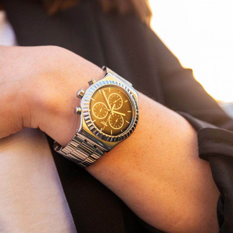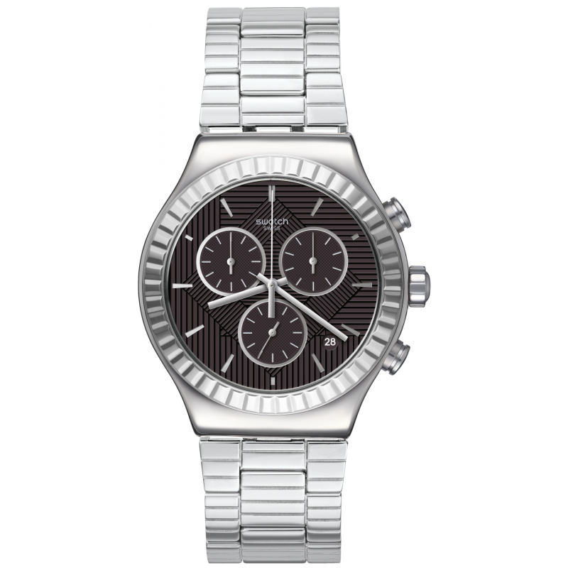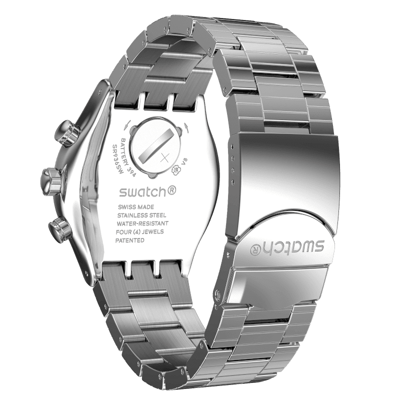 Montre Mixte Swatch Joe's Smile YVS471G - Mouvement Quartz - Etanche 30 mètres - Bracelet en Acier inoxydable ajustable - Fermoir et bracelet en Acier inoxydable - Fermoir Papillon - Boitier Rond - Dimensions 43 x 49 x 12.67 mm - Garantie 2 ans