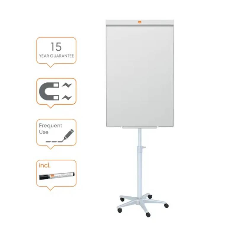 Tableau Blanc Magnétique NOBO - Cadre contemporain fin et discret - Base mobile réglable en hauteur (175 à 200 cm) - Crochets inclus pour accrocher un bloc de papier Nobo pour chevalet de conférence - Surface magnétique en acier laqué offrant une effaçabilité accrue, pour une utilisation modérée - Poids : 8.9 Kg - Dimension de Tableau : 700 x 2001 x 600 mm