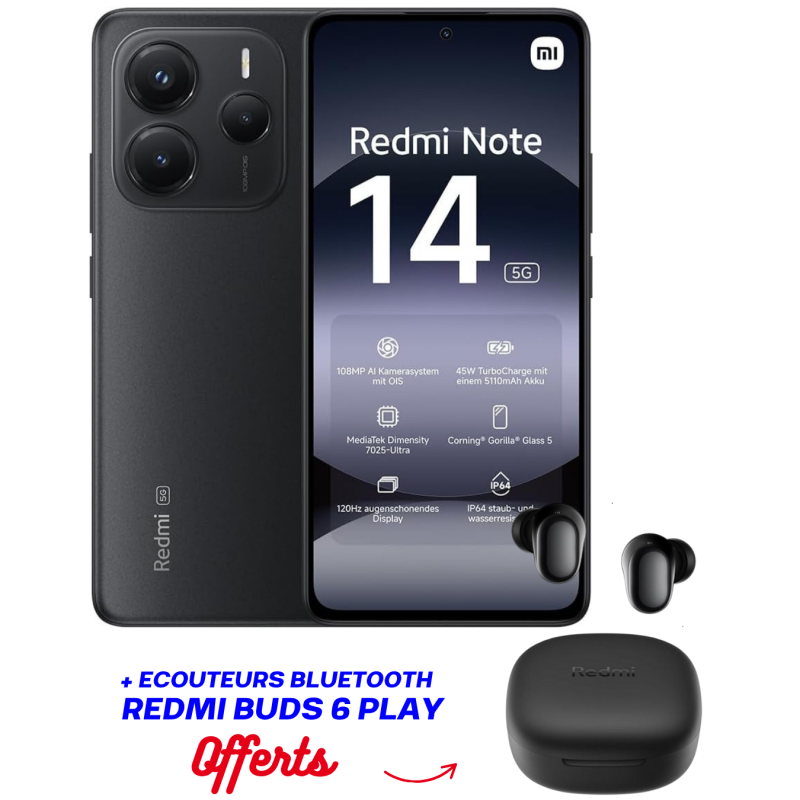 Smartphone XIAOMI Redmi Note 14 / 5G / 6 Go / 128 Go / Noir + Ecouteurs Bluetooth Redmi buds 6 play Offerts