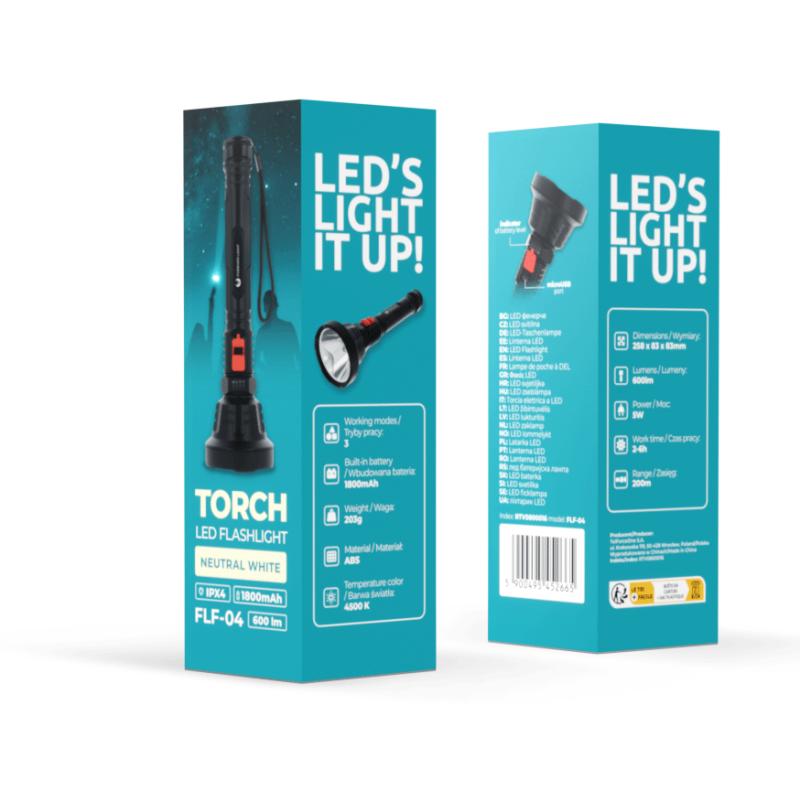 Lampe torche LED Forever Light - Nombre de lumens : 600 lm - Capacité de la batterie : 1 800 mAh - Durée maximale de travail : 3h - Temps de charge : 4h - Indice de protection : IP44 - Poids net : 203 g - Couleur : Noir