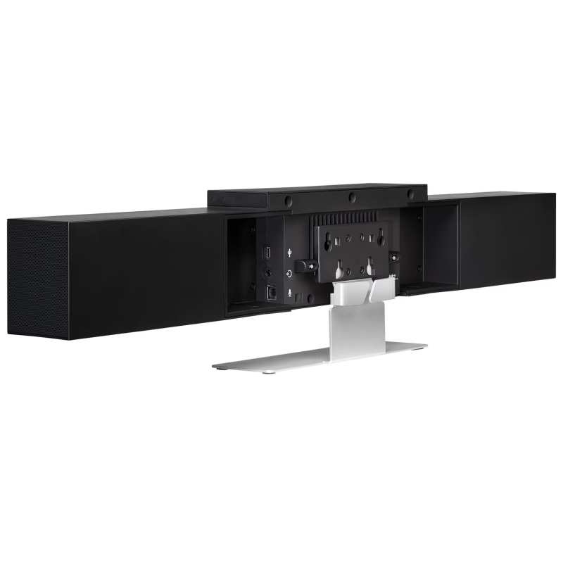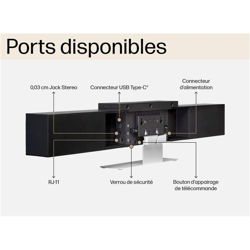 Barre vidéo USB HP Poly Studio - Capacités de cache-objectif : Intégré - Cadence de la vidéo : 30 fps (up to 4K resolution) - Fonctions de zoom : x5 - Champ de vision diagonale (dFoV) : 120° - Idéale pour les salles de 5 à 10 personnes - Suppression des bruits autres que la voix humaine via les fonctions "NoiseBlock & Acoustic Fence - Ports : 1 port USB Type-C, vitesse de transfert 5 Gbit/s, 1 entrée audio, 1 entrée auxiliaire (microphone en option) - Technologies sans : Bluetooth 4.2, Wi-Fi - Sensibilité (haut-parleur) : 90 dB - Bande passante du haut-parleur : 100 Hz à 20 kHz - Type de microphone : Ensemble de six microphones à formation en faisceau - Systèmes d'exploitation supportés : Windows 7, 10, 11, 8.1, macOS 10.12, macOS 10.13, macOS 10.14 - Dimensions minimales: 156 x 700 x 70 (avec perche) - Poids: 2 856 kg - Couleur Noir - Garantie 1 an